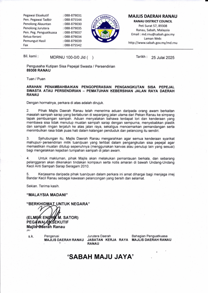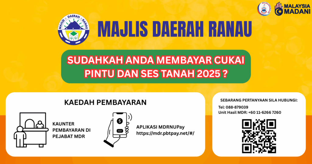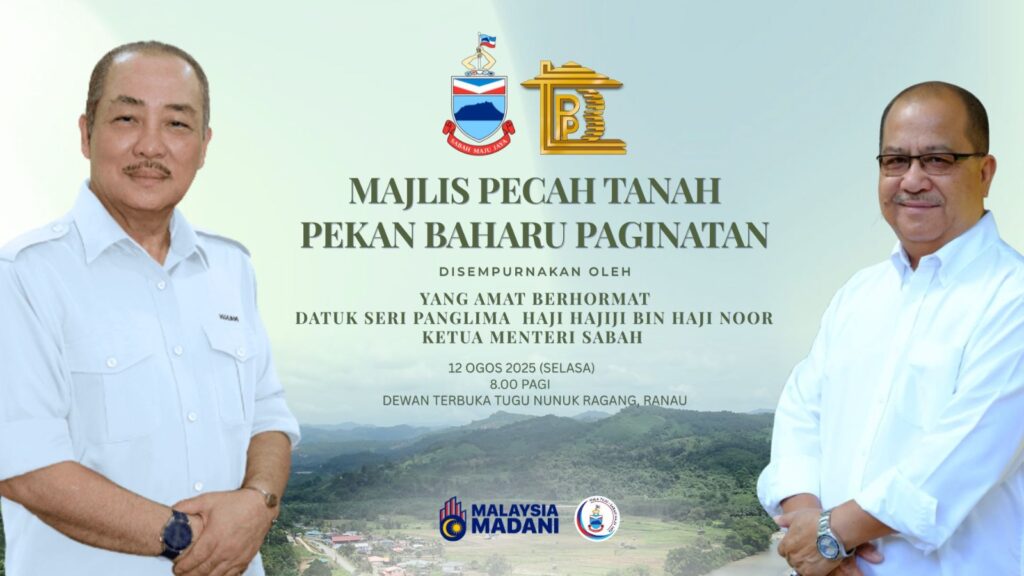 MAJLIS PECAH TANAH PEKAN BAHARU PAGINATAN Langkah awal menuju pembangunan baharu di Paginatan! Majlis Daerah Ranau menyokong penuh pelaksanaan Majlis Pecah Tanah Pekan Baharu Paginatan yang akan diadakan seperti berikut: 12 Ogos 2025 (Selasa) 8.00 pagi Dewan Terbuka Tugu Nunuk Ragang, Ranau Majlis ini akan disempurnakan oleh: YAB Ketua Menteri Sabah, Datuk Seri Panglima Haji […]