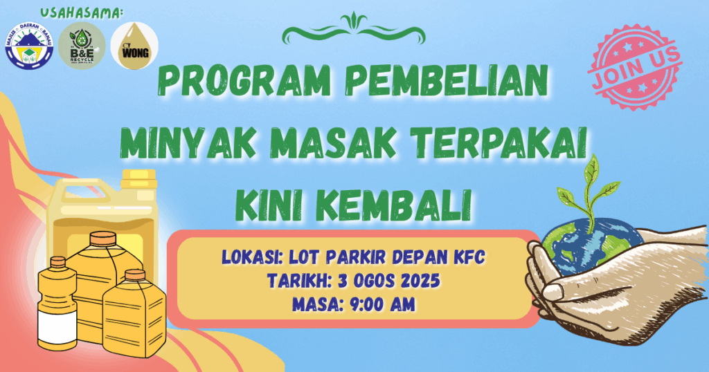 PROGRAM PEMBELIAN MINYAK MASAK TERPAKAI KEMBALI LAGI! Jom jual minyak masak terpakai anda dan bantu selamatkan alam sekitar! Program ini kini kembali hasil kerjasama antara Majlis Daerah Ranau , B&E Recycle dan CY WONG Recycle Trading. Lokasi: Lot Parkir Depan KFC Tarikh: 3 Ogos 2025 (Ahad) Masa: 9:00 pagi Bawa minyak masak terpakai anda yang […]